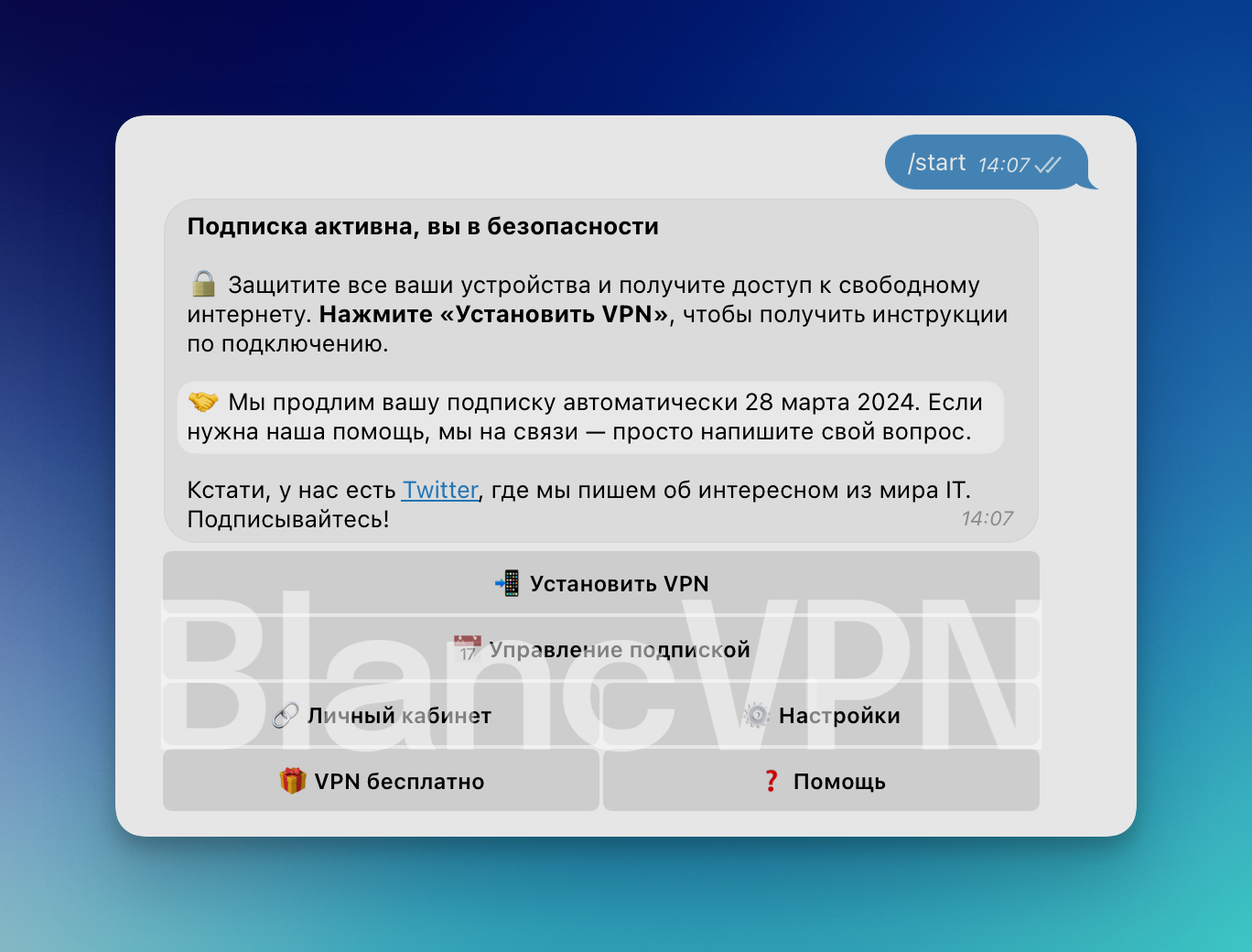 Откройте Telegram-бот BlancVPN. Перейдите в Главное меню, отправив команду